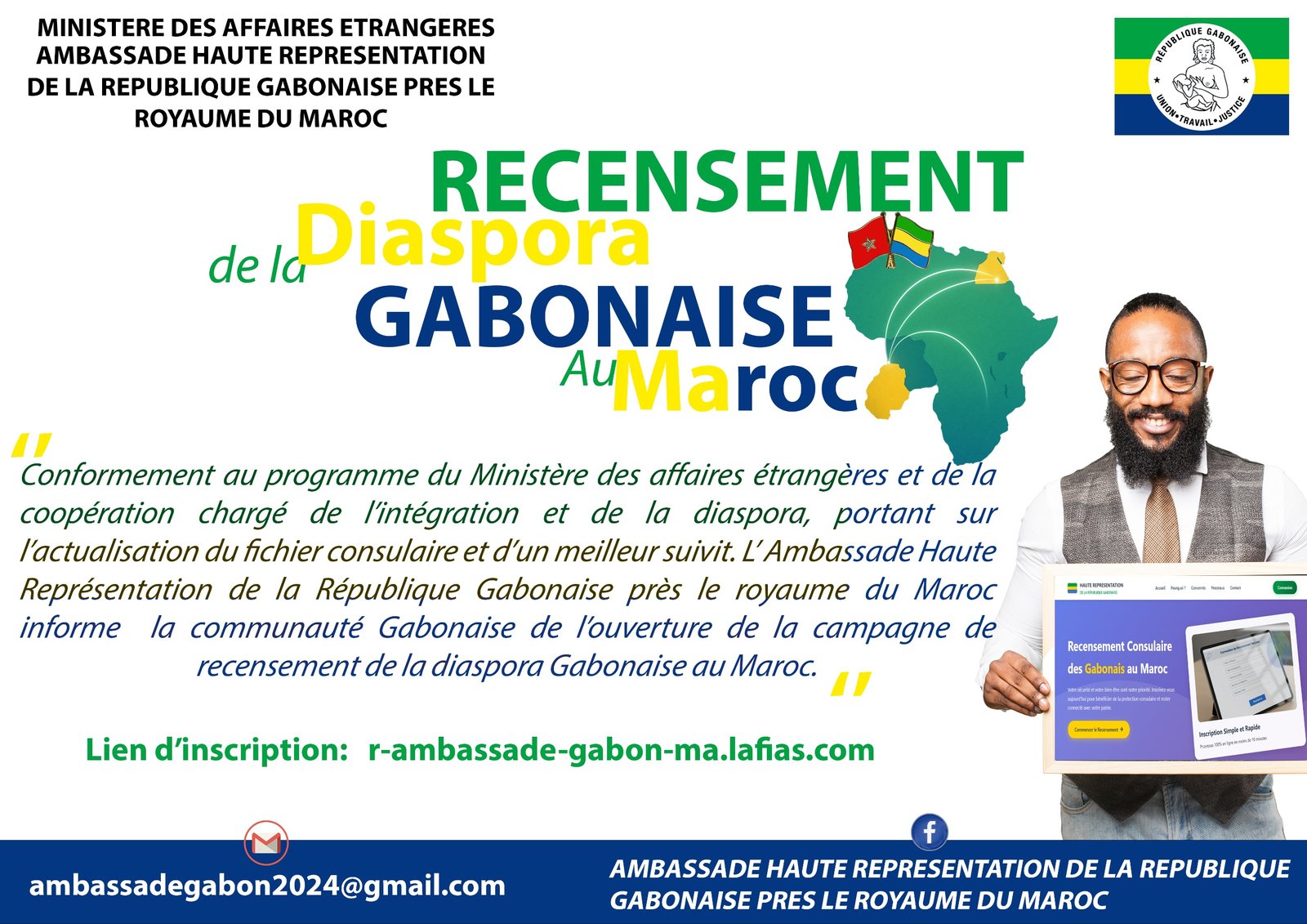 L’ Ambassade Haute Représentation de la République Gabonaise près le royaume du Maroc informe la communauté Gabonaise de l’ouverture de la campagne de recensement de la diaspora Gabonaise au Maroc.